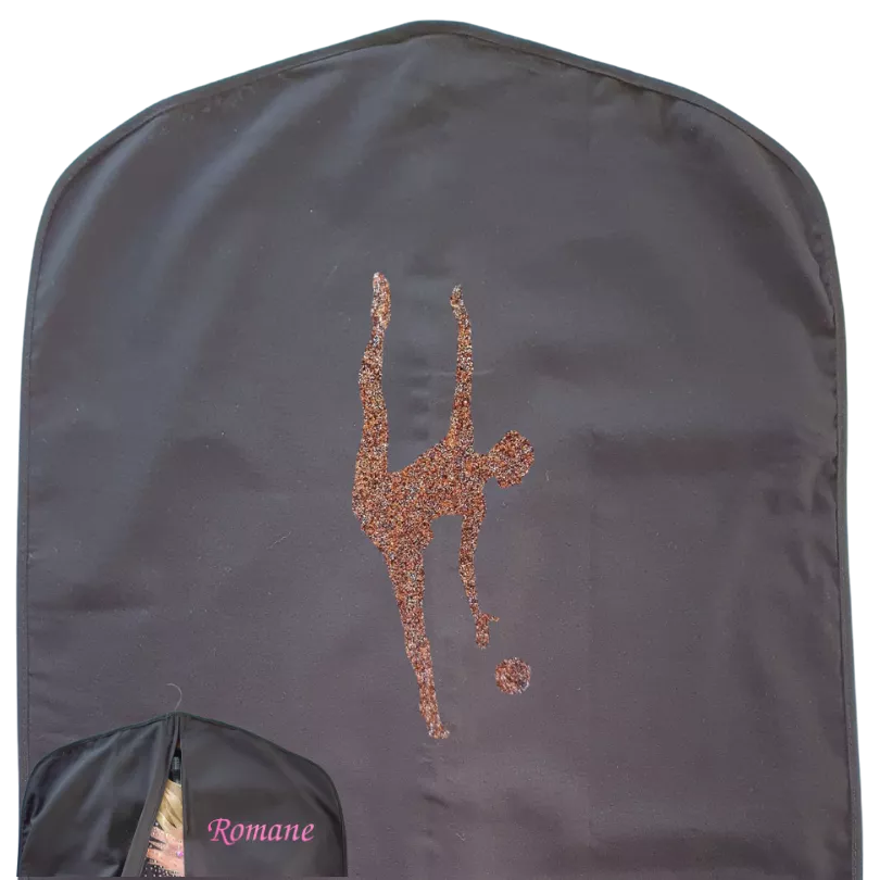 Voici la housse de justaucorps noir, personnalisable avec un motif en flocage appliqué au dos de la housse. Devant, choisissez le coloris et le modèle de l'écriture idéal pour le flocage du prénom.