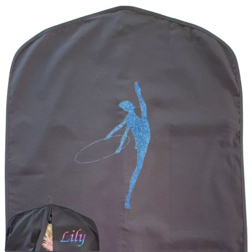 Voici la housse de justaucorps noir, personnalisable avec un motif en flocage appliqué au dos de la housse. Devant, choisissez le coloris et le modèle de l'écriture idéal pour le flocage du prénom.