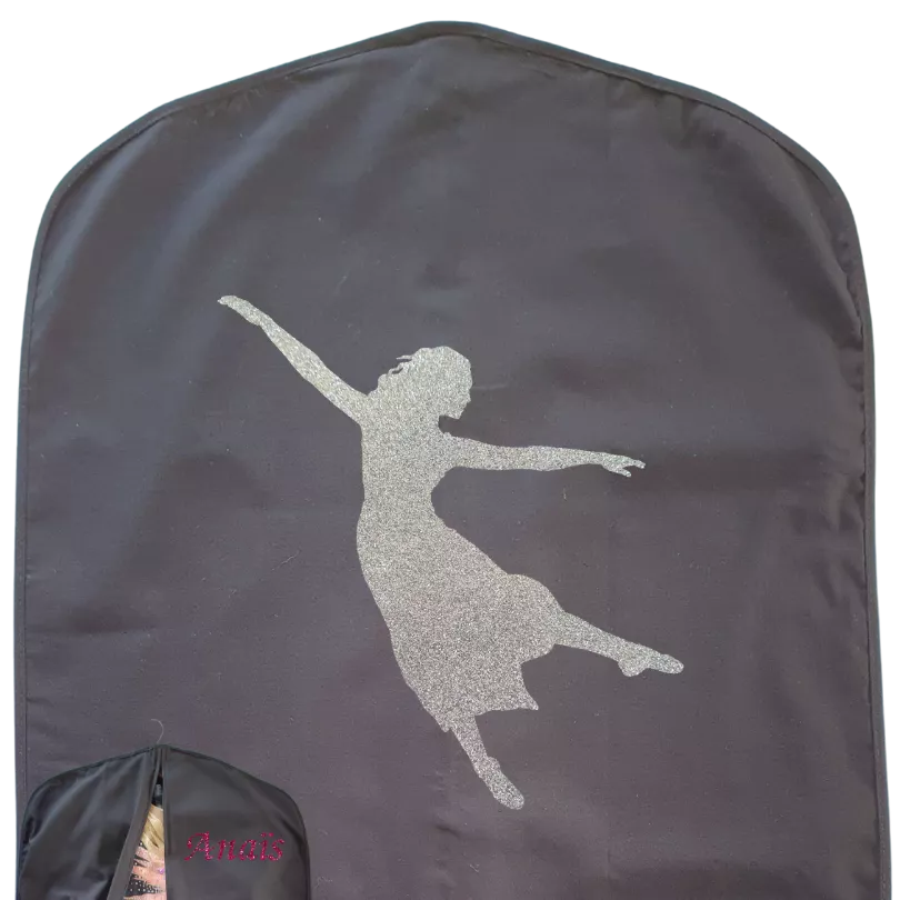 Voici la housse de justaucorps noir, personnalisable avec un motif en flocage appliqué au dos de la housse. Devant, choisissez le coloris et le modèle de l'écriture idéal pour le flocage du prénom.