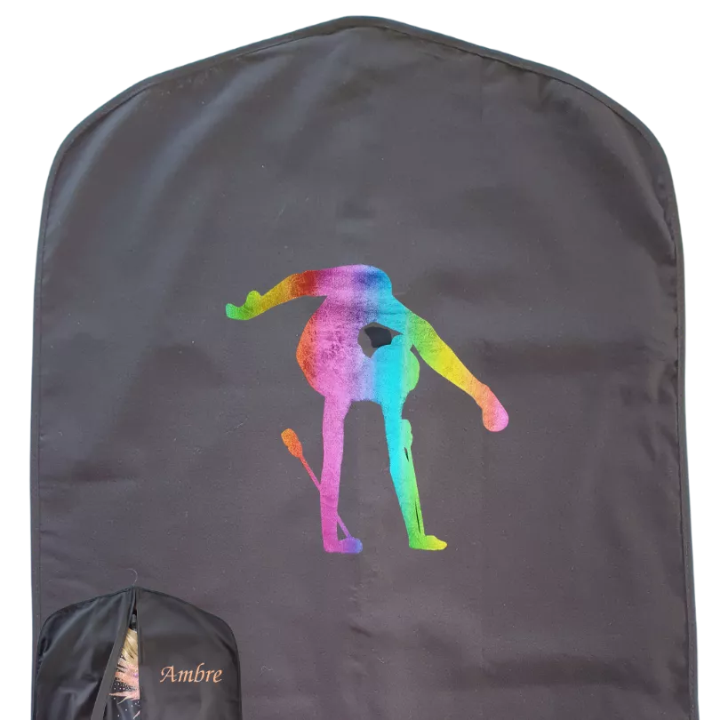 Voici la housse de justaucorps noir, personnalisable avec un motif en flocage appliqué au dos de la housse. Devant, choisissez le coloris et le modèle de l'écriture idéal pour le flocage du prénom.