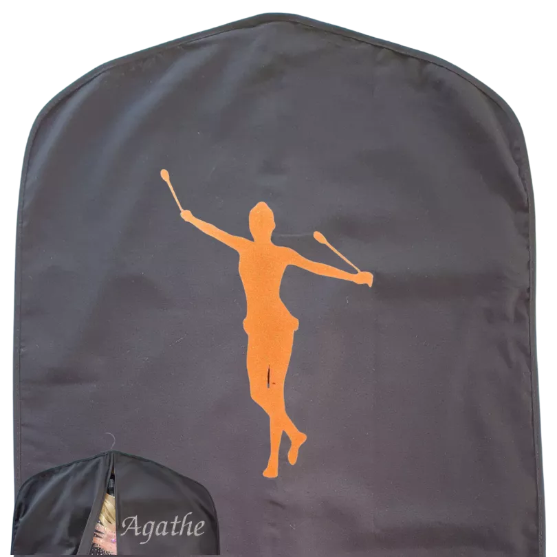 Voici la housse de justaucorps en coton noir, personnalisable avec un motif en flocage appliqué au dos de la housse. Devant, choisissez le coloris de l'écriture idéal pour le flocage du prénom.