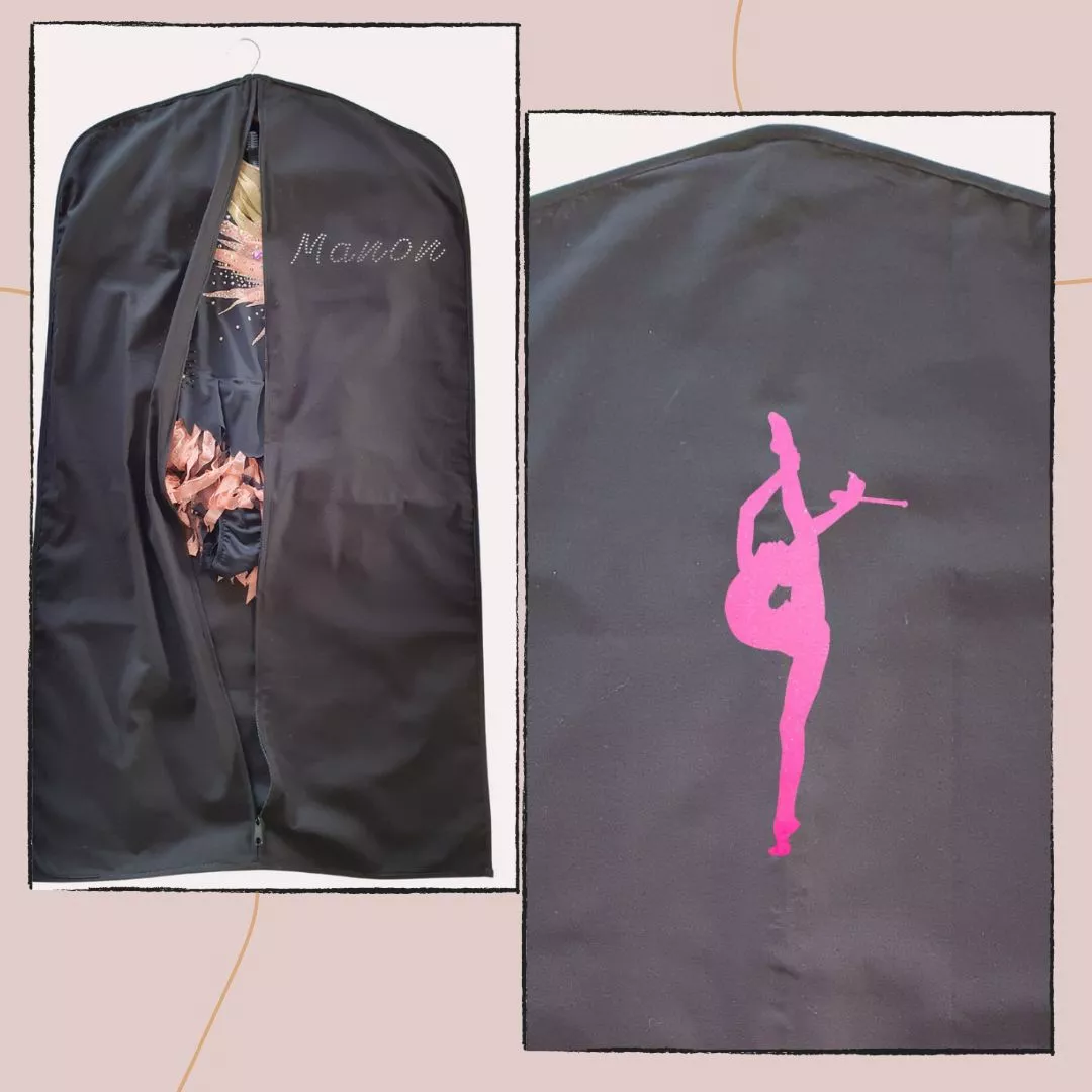 Voici la housse de justaucorps en coton noir, personnalisable avec un motif en flocage appliqué au dos de la housse. Devant, choisissez le coloris et le modèle de l'écriture idéal pour le flocage du prénom.