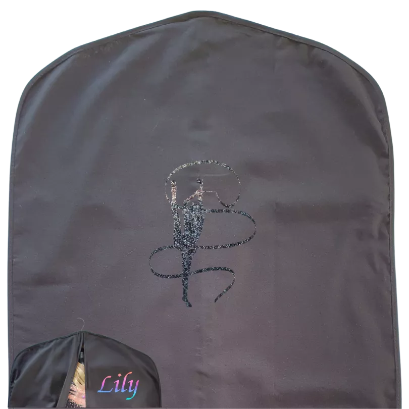 Voici la housse de justaucorps noir, personnalisable avec un motif en flocage appliqué au dos de la housse. Devant, choisissez le coloris et le modèle de l'écriture idéal pour le flocage du prénom.