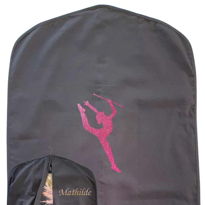 Voici la housse de justaucorps en coton noir, personnalisable avec un motif en flocage appliqué au dos de la housse. Devant, choisissez le coloris et le modèle de l'écriture idéal pour le flocage du prénom.
