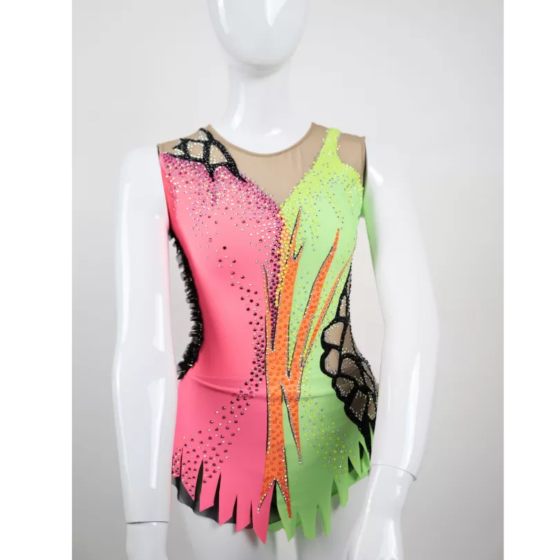 Ce justaucorps est un mélange de voile chair, vert fluo, rose fluo et orange fluo. Sans manches, il est décoré de motifs découpé dans du lycra noir, qui ajoutent une touche de d'originalité et de dynamisme. Des strass sont jaune fluo sont disposés sur le haut du buste créant un effet de dégradé de couleur captivant. C'est une modèle qui attire le regard avec son style asymétrique, ses détails scintillants et ses découpes originales.