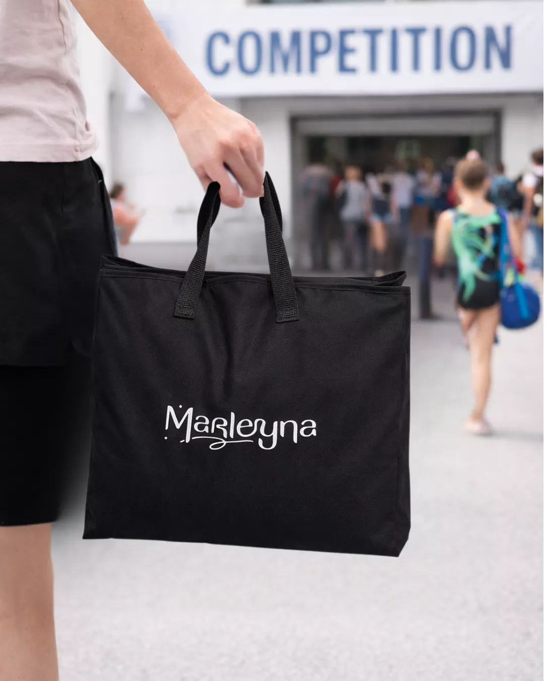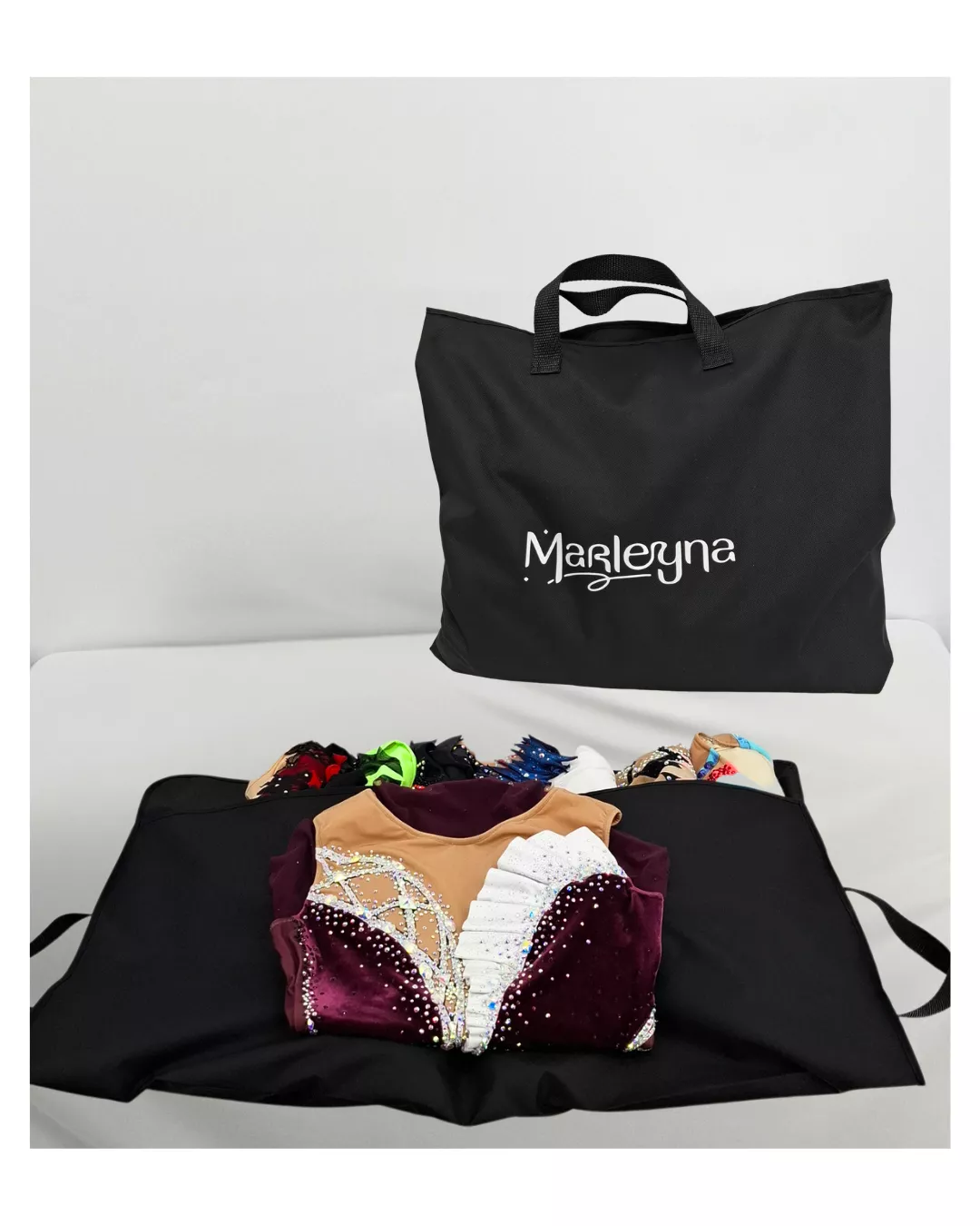 Le sac pochette Marleyna a été conçu pour ranger et transporter facilement les justaucorps de gymnastique lors des déplacements vers les spectacles et compétitions.