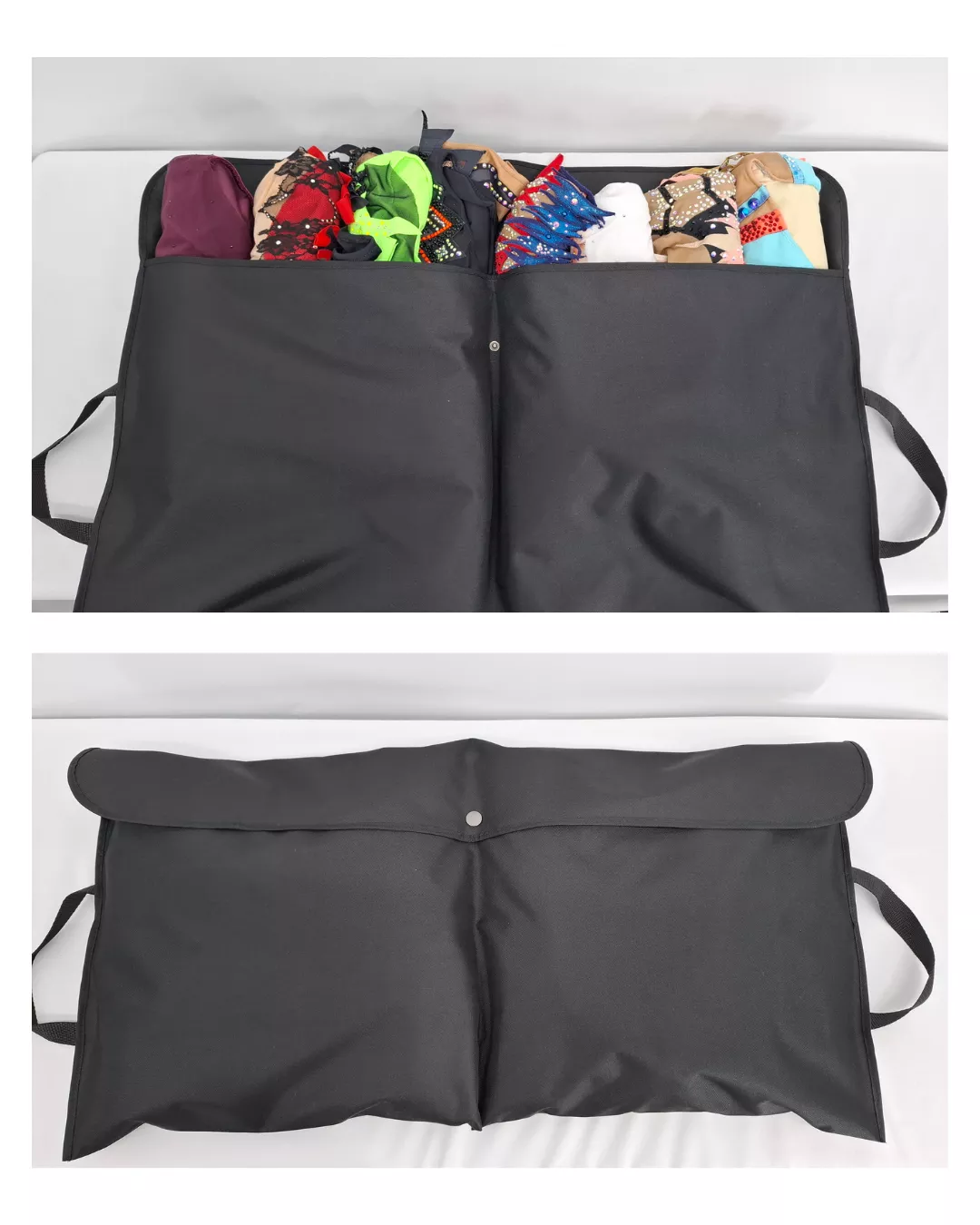 Ce modèle d’une grande capacité, peut contenir jusqu’à 8 à 10 tenues, dans une même pochette, 5 justaucorps par poches, tout en les protégeant pendant le transport.