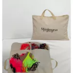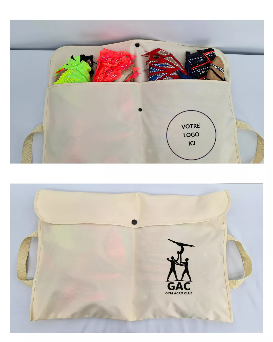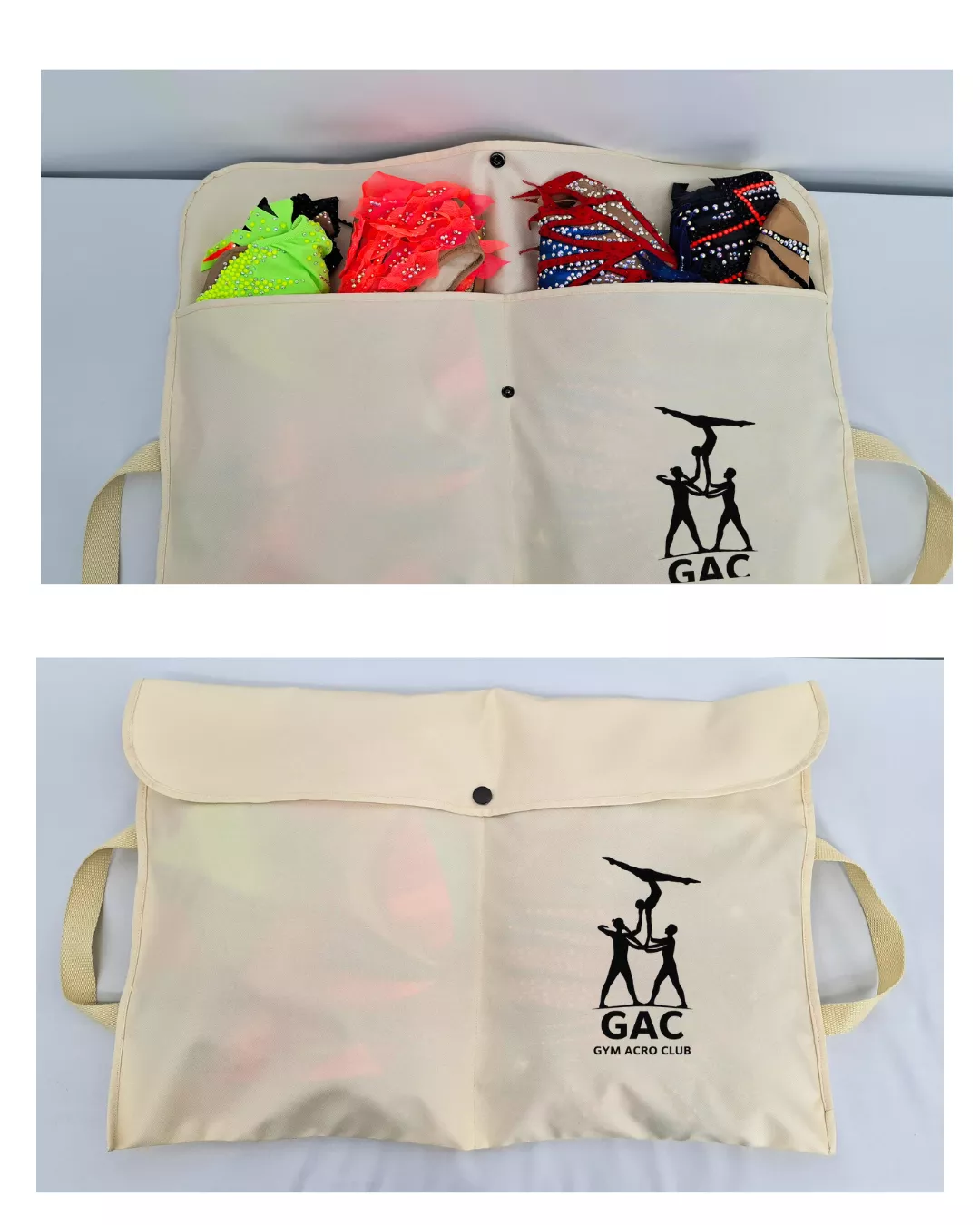 Sa taille de 30 cm X 38 cm plié, et de 60 cm X 38 cm ouverte, permet de regrouper jusqu'à 6 justaucorps dans un seul sac, ce qui facilite l'organisation pour les clubs, les entraîneurs et les gymnastes.