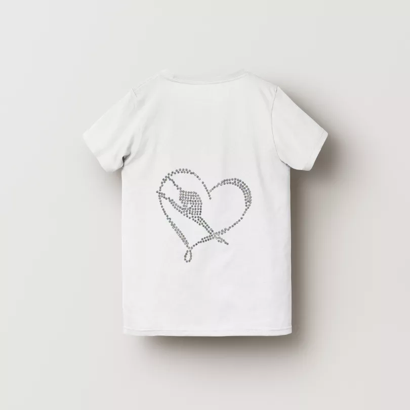 Ce transfert est disponible en plusieurs coloris de ruban : bleu, rose, or ou cristal. Le motif représente un ruban en forme de cœur, avec des strass disposés de manière à souligner la forme du cœur et à créer un effet scintillant et élégant.